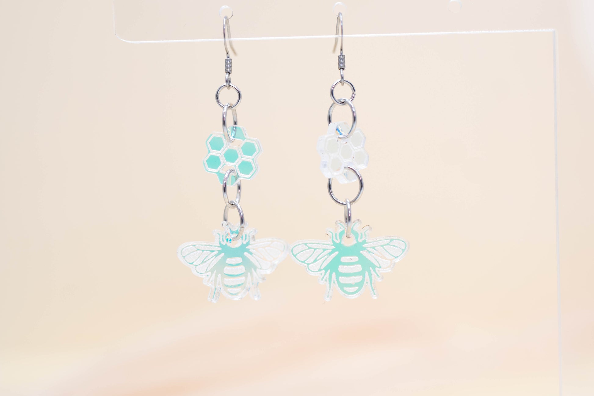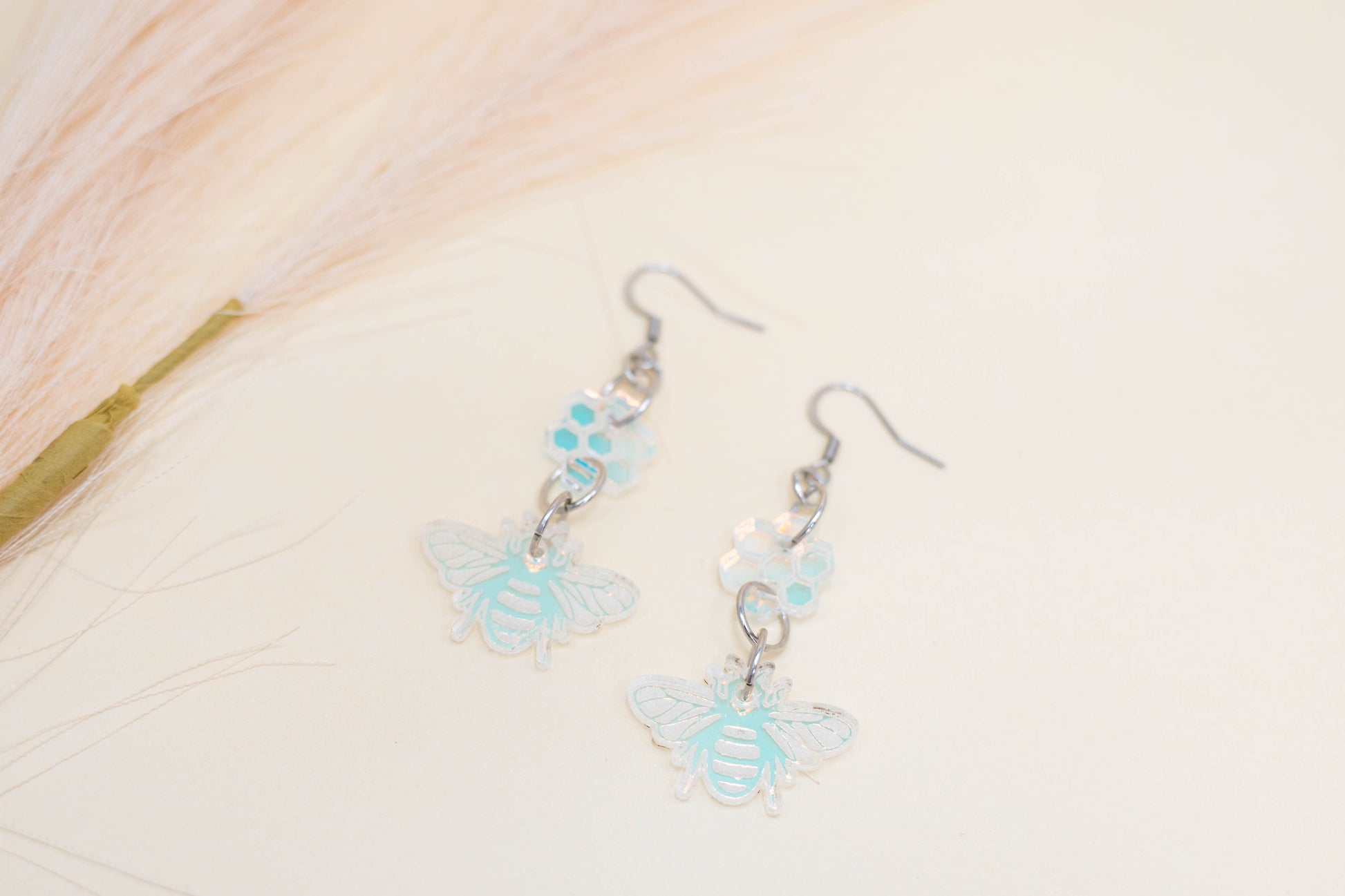 These iridescent bee and honeycomb earrings bring a soft glow that shifts with the light, showing off hues of aqua, pearl, and icy blue. Crafted from lightweight acrylic, they are both playful and elegant, making them the perfect accessory for bee lovers and those who adore a little sparkle.